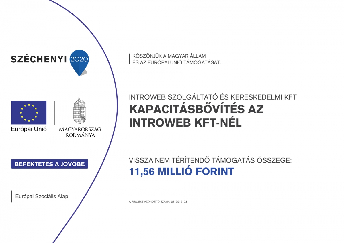 A Széchenyi 2020 program keretében valósul meg a 3315916103 azonosítószámú, Kapacitásbővítés az Introweb Kft-nél című projekt.